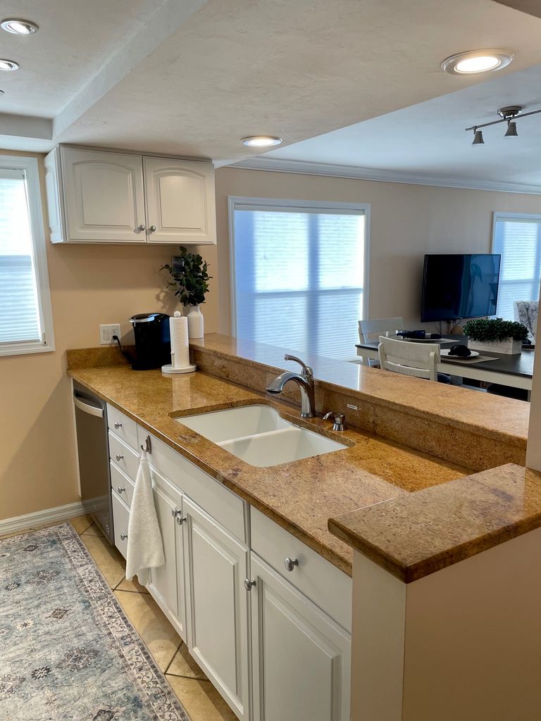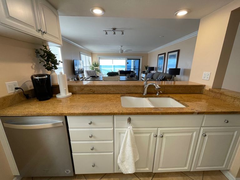 Kitchen counter, sink, dishwasher and coffee maker